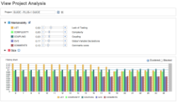 Quality Monitor™ code analysis: the view shows quality indicators of a system evolving over versions. Quality Monitor™ code analysis: the view shows the package structure of classes.